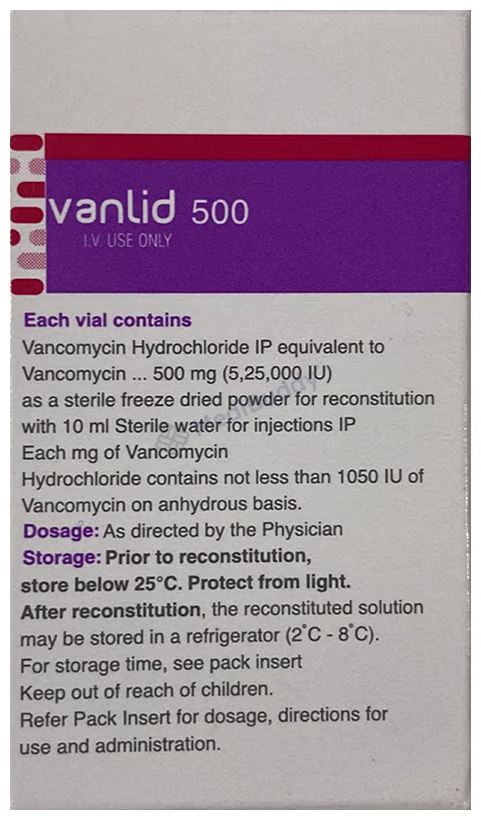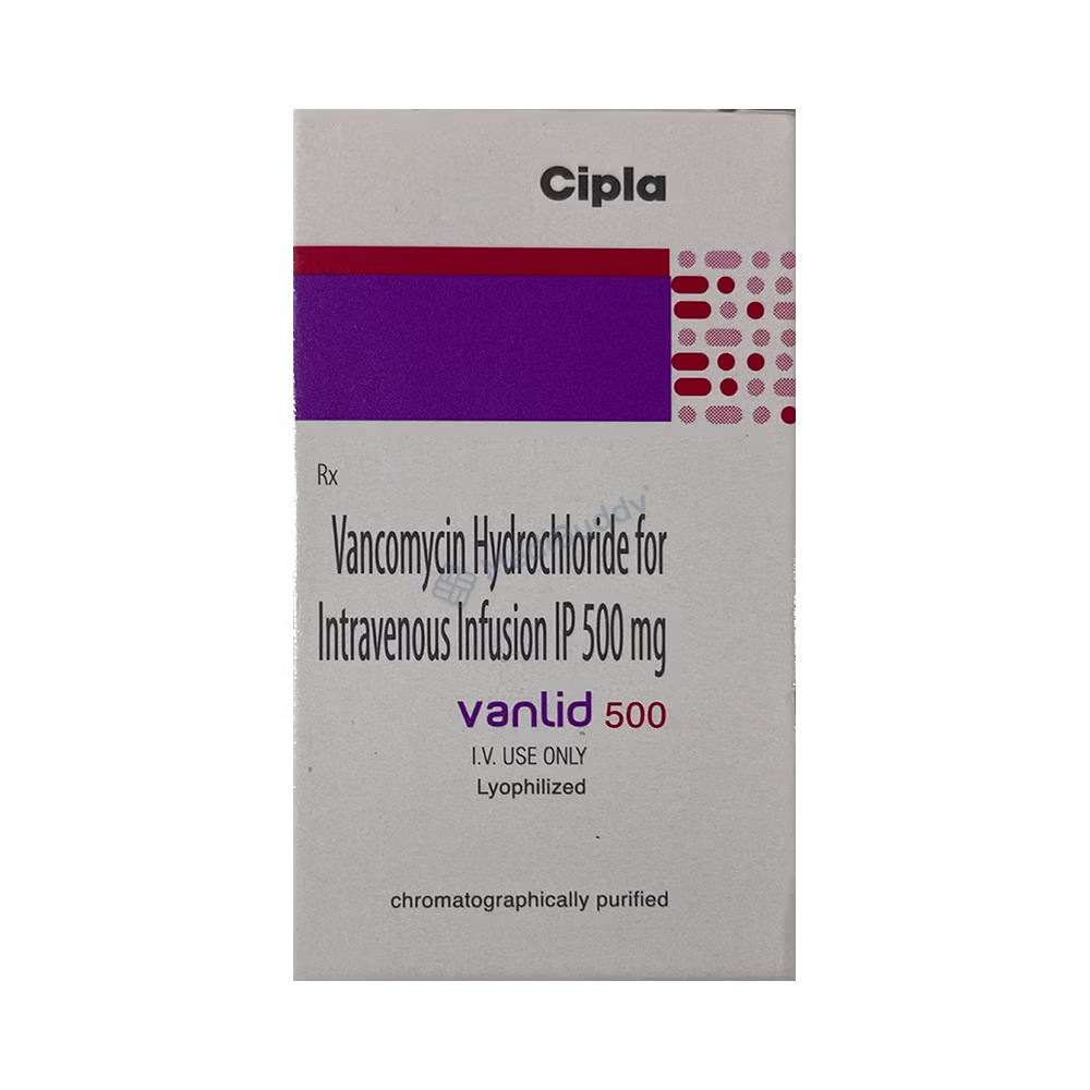 Vanlid 500 Infusion is a potent medication used to combat severe bacterial infections in hospitalized patients. This infusion contains Vancomycin, a powerful ingredient that works by eliminating bacteria responsible for serious infections. By targeting the bacteria's ability to form protective cell walls, Vanlid 500 Infusion effectively eradicates the harmful microorganisms causing illnesses such as pneumonia, urinary tract infections, ulcerative colitis, bacterial septicemia, osteomyelitis, endocarditis, skin and soft tissue infections, surgical site infections, and lower respiratory tract infections. Administered by a healthcare professional through a vein, this medication begins to alleviate symptoms rapidly, leading to a noticeable improvement in your condition. It is crucial to adhere to the prescribed treatment regimen even if you start feeling better, as completing the full course ensures that all bacteria are eradicated and prevents the development of resistance. Trust in Vanlid 500 Infusion to effectively combat bacterial infections and restore your health under the guidance of medical professionals.