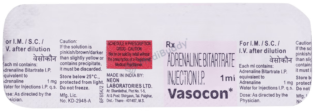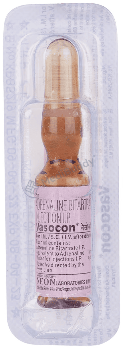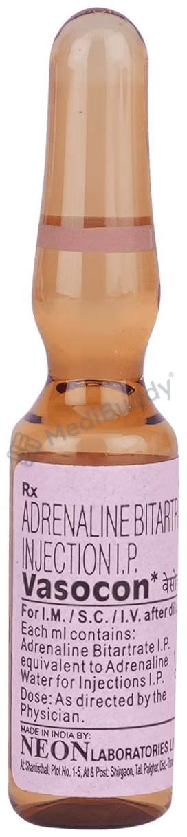 Vasocon Injection is a medication used in critical situations to treat severe allergic reactions, cardiac arrest, and anaphylactic shock. It quickly helps alleviate breathing difficulties, wheezing, and swelling in the face or tongue associated with allergic reactions. This injection stimulates the heart, increases blood pressure, and relaxes the airways to restore normal breathing during emergencies.