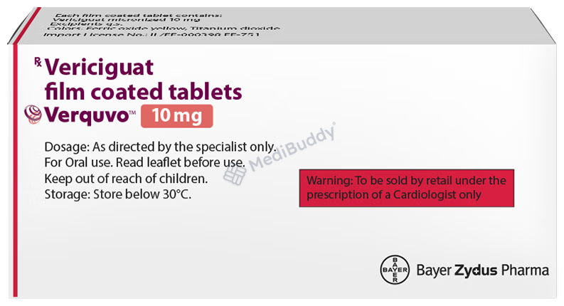 Verquvo 10mg Tablet is a medication used in the treatment of heart failure. It belongs to the class of medications known as soluble guanylate cyclase (sGC) stimulators. This medication works by increasing the pumping activity of the heart and relaxing the blood vessels. This helps to improve blood circulation throughout the body, reducing the risk of death and the need for hospitalization in adults with heart failure.