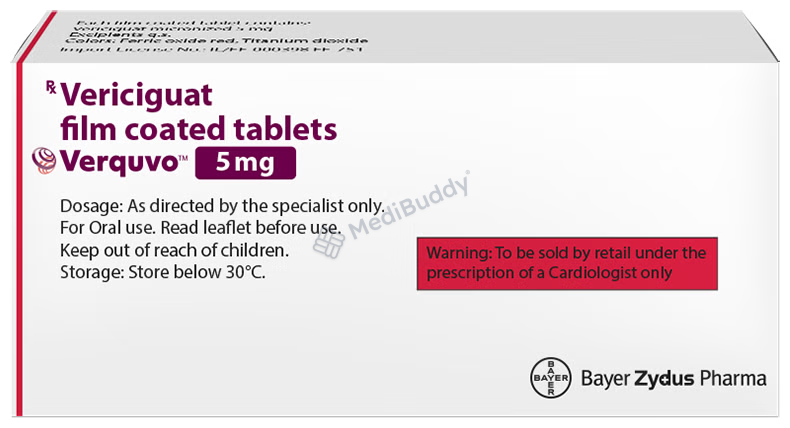Verquvo 5mg Tablet is a medication used in the treatment of heart failure, a condition where the heart has difficulty pumping blood effectively. This tablet works by increasing the pumping activity of the heart and relaxing the blood vessels, which helps improve blood circulation throughout the body. It belongs to the class of medications known as soluble guanylate cyclase (sGC) stimulators and contains Vericiguat as the active ingredient.
