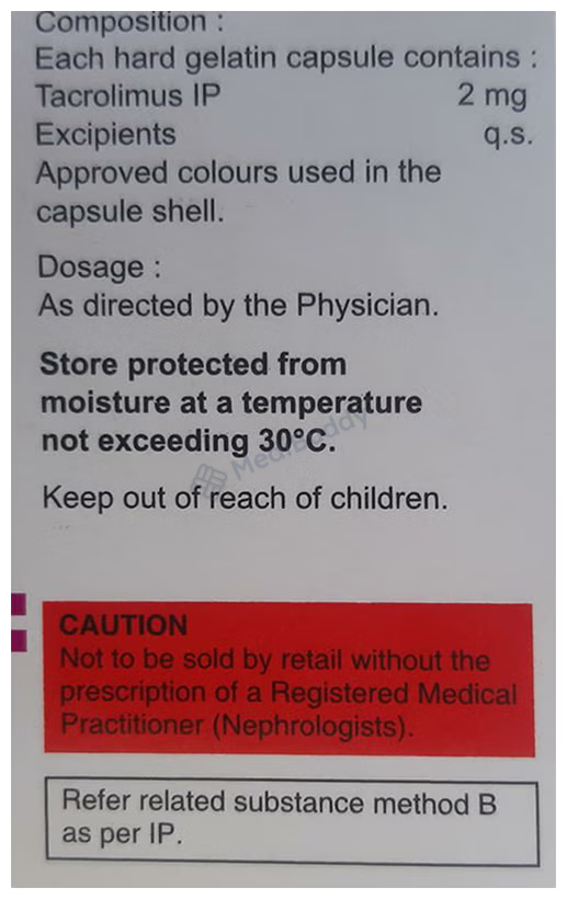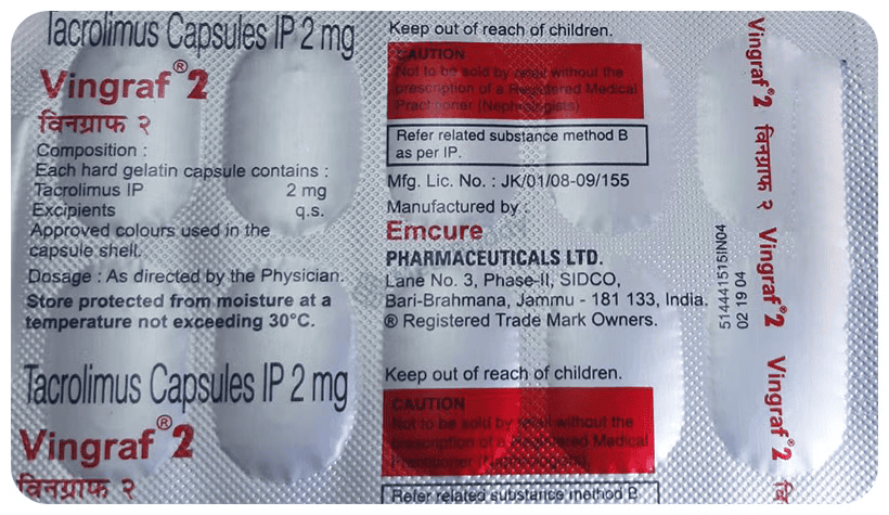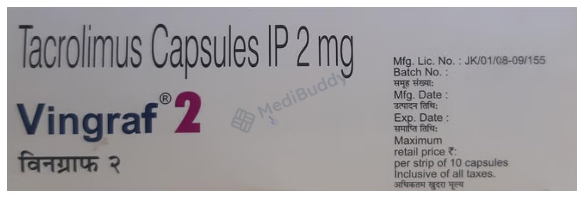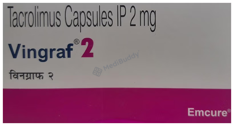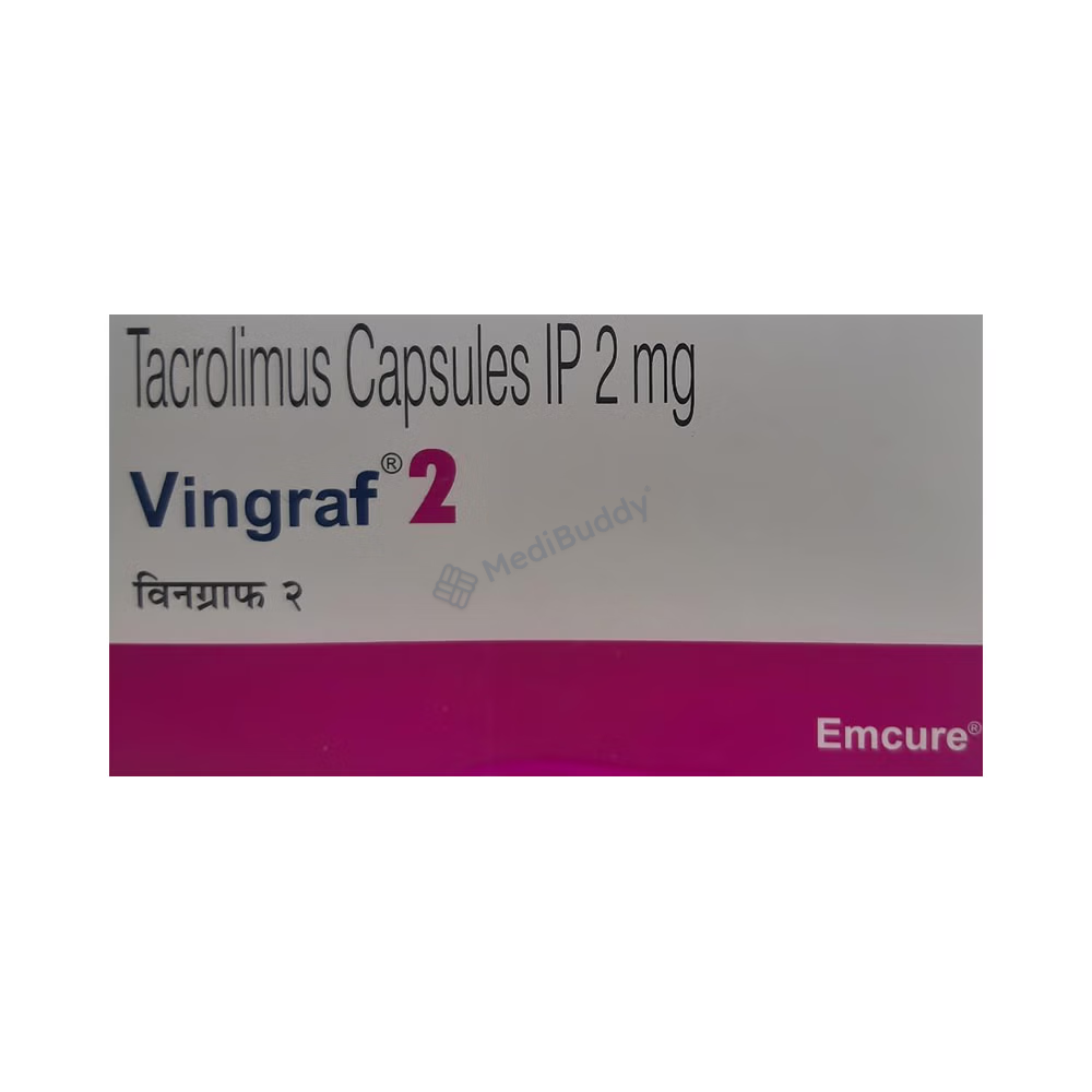 Before taking Vingraf 2mg Capsule, it is important to inform your doctor about any allergies to Tacrolimus or other medications. If you are pregnant or breastfeeding, consult your doctor before using this medication. Avoid consuming alcohol while on Vingraf 2mg Capsule. Be cautious while driving, as it may cause vision issues or nervous disturbances. Notify your doctor if you are planning to get vaccinated. Vingraf 2mg Capsule can increase the risk of infections or skin cancer by reducing the body's immune system. Wear protective clothing and sunscreen when outdoors. When preparing the oral suspension, use glass or metal materials, not plastic, as the granules may stick and affect dose accuracy. Do not inhale or let the granules touch your skin or eyes. In case of accidental contact, wash the area with soap and water, or rinse the eyes with plain water.