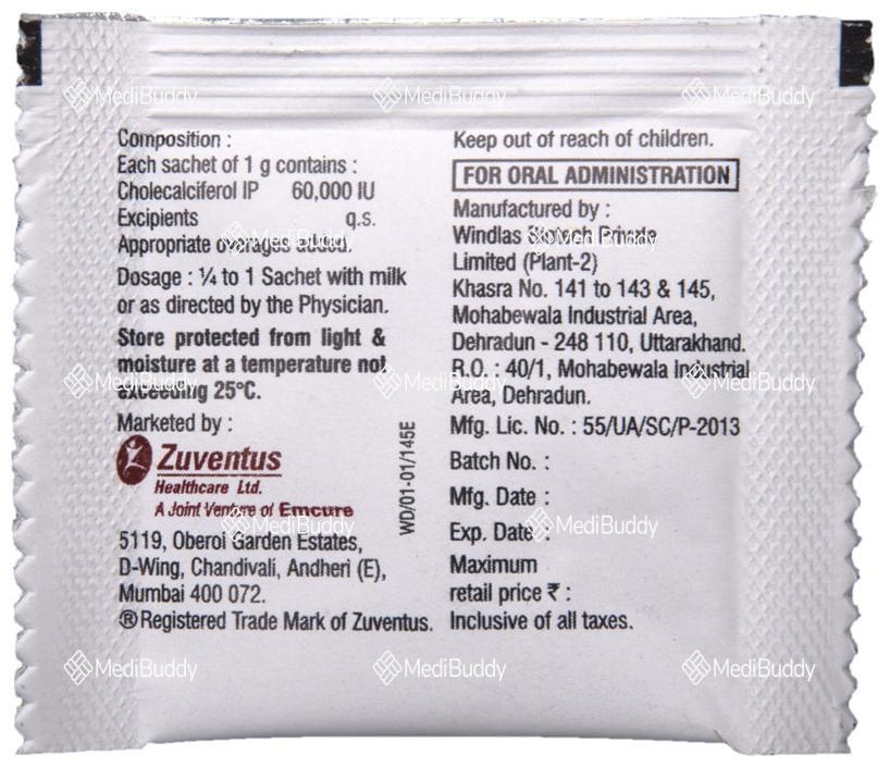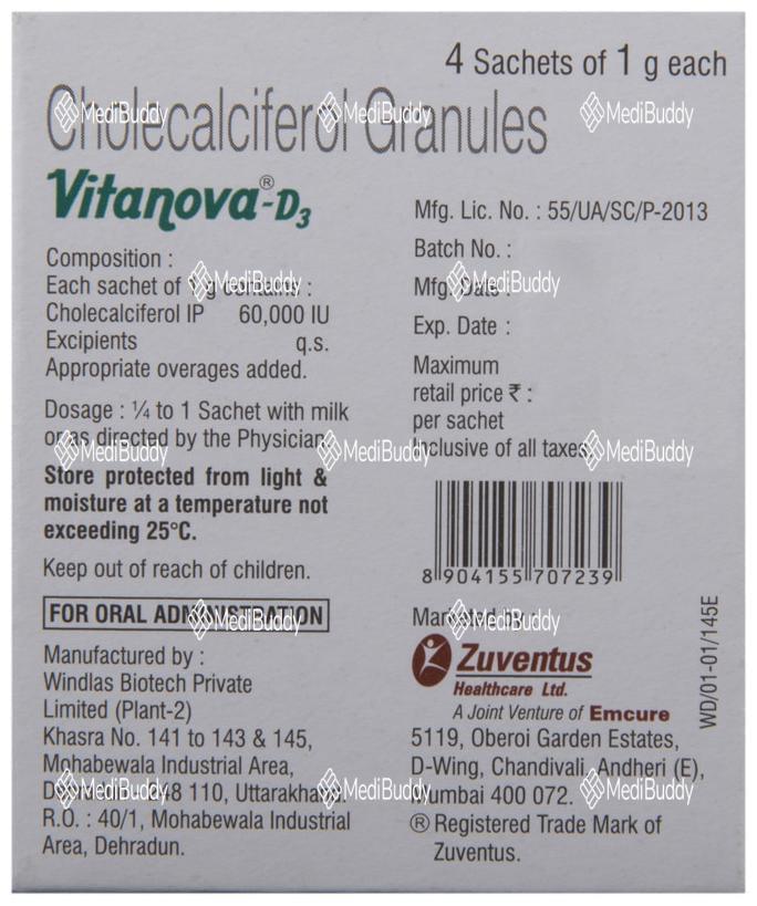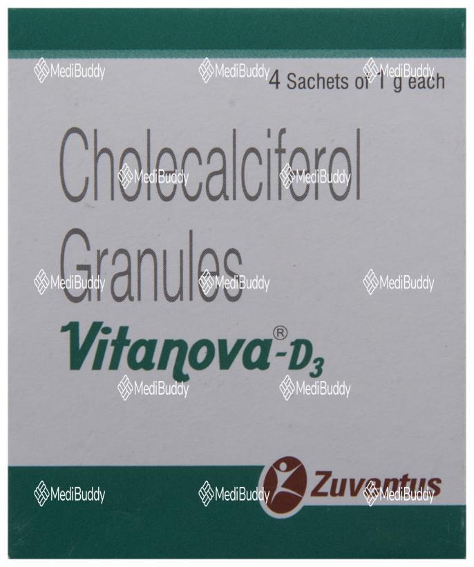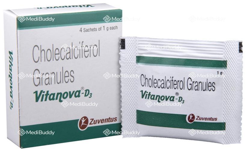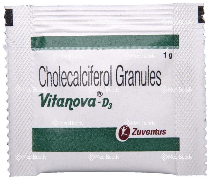 Vitanova-D3 Sachet is a supplement containing Cholecalciferol I.P., a form of Vitamin D3. This vitamin is crucial for maintaining healthy bones, as it helps in their growth, formation, and maintenance. A deficiency in Vitamin D3 can lead to various bone-related disorders such as osteoporosis, hypoparathyroidism, and rickets. Additionally, Vitamin D3 plays a vital role in the absorption of calcium, which is essential for keeping bones strong and preventing conditions associated with weak and brittle bones.