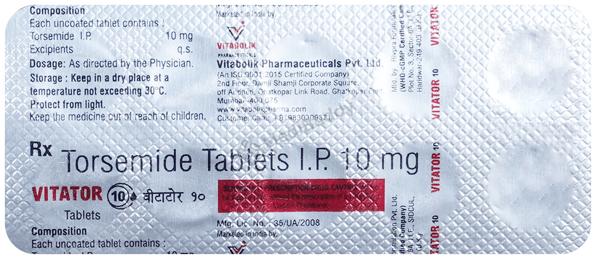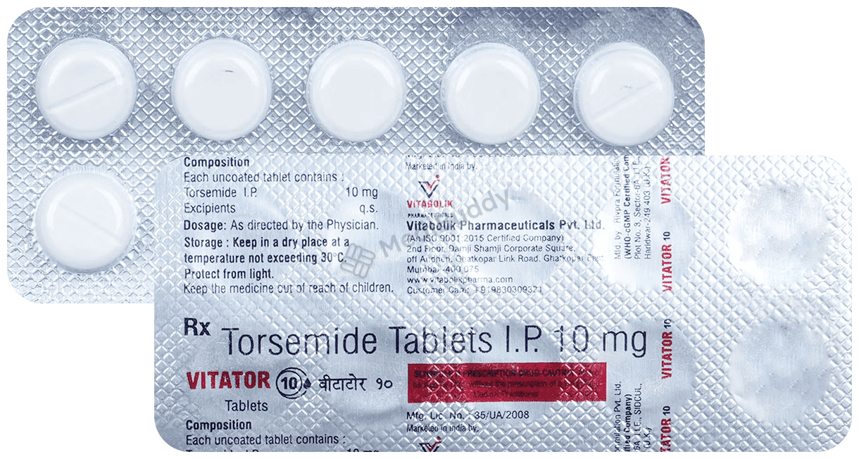 Before consuming Vitator 10mg Tablet, it is crucial to be aware of certain factors. This medication belongs to a group of diuretics, which are also known as water tablets. It is primarily used to address swelling (edema) caused by excess water in individuals with heart failure, liver issues, or kidney problems. Additionally, Vitator 10mg Tablet is prescribed to manage high blood pressure.