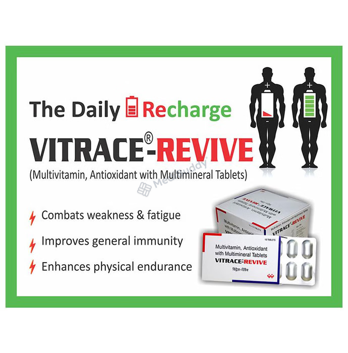 Vitrace Revive Tablet is a nutritional dietary supplement designed to enhance overall health and well-being. Packed with essential multivitamins and minerals, this tablet plays a vital role in supporting the growth and development of the human body. One of the key ingredients, Methylcobalamin, present in the capsule, helps in preventing Vitamin B12 deficiency, a condition that can potentially lead to anemia, ensuring optimal health.