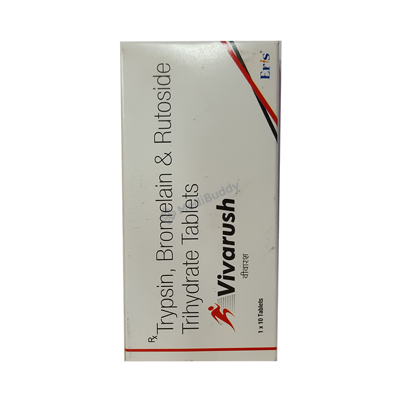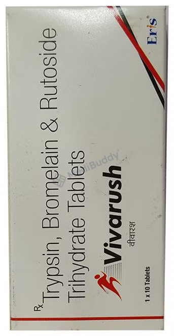 The combination of ingredients in Vivarush Tablet includes an antioxidant called Rutoside, along with two enzymes - Trypsin and Bromelain. Rutoside acts as an antioxidant, protecting the body from cell damage caused by free radicals and reducing swelling. Trypsin helps in the removal of dead skin cells to promote healthy tissue growth, while Bromelain, derived from pineapple extract, helps in limiting fibrin formation and reducing clots at the site of injury or damage.
