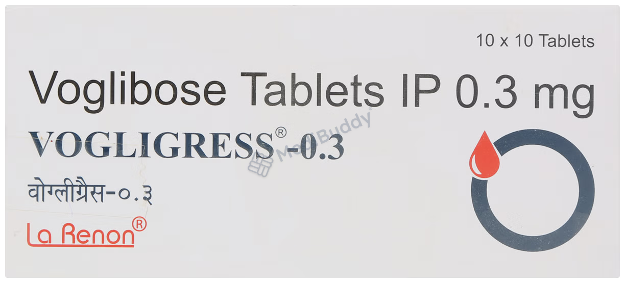 Vogligress 0.3mg Tablet is a medication prescribed to manage type 2 diabetes mellitus. It is particularly beneficial in controlling high blood sugar levels after meals, especially when other medications and a controlled diet have not been effective. It is essential to take Vogligress 0.3mg Tablet just before a meal, with the dosage and frequency determined by your doctor to ensure balanced blood sugar levels. Abruptly stopping this medication can lead to increased blood sugar levels and potential severe complications like kidney damage and vision problems.