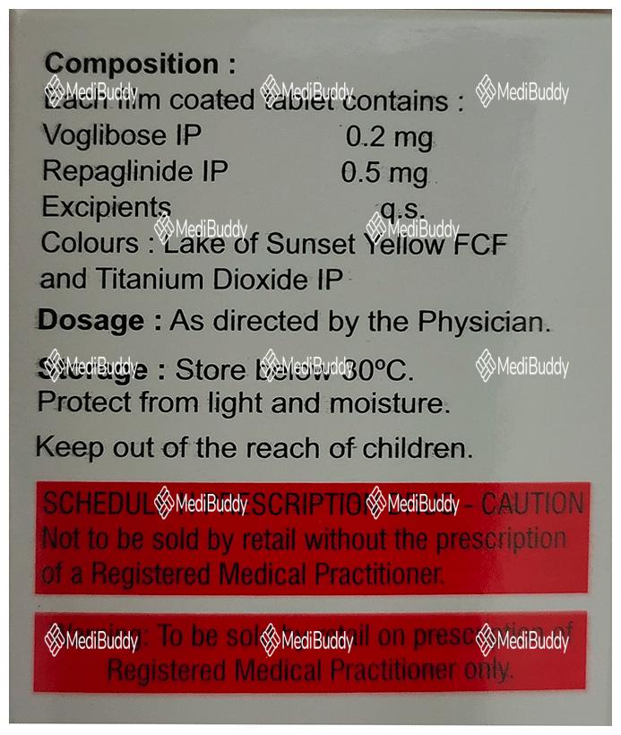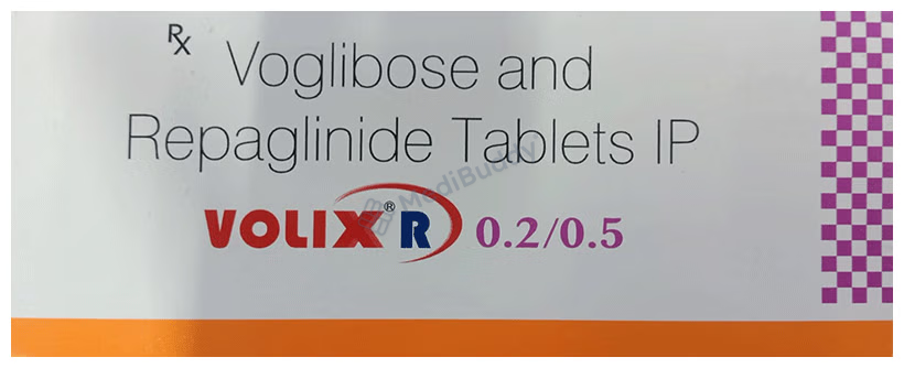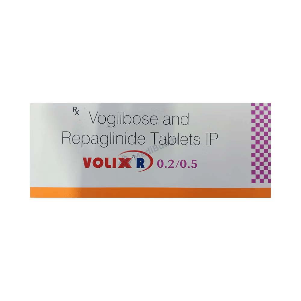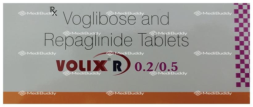 Volix R 0.2/0.5 Tablet is a combination medication containing Repaglinide and Voglibose, classified as Anti-diabetic agents. This medication is used in the management of type 2 diabetes mellitus to help control blood sugar levels in the body. It is specifically indicated as an adjunct to diet and exercise regimens.