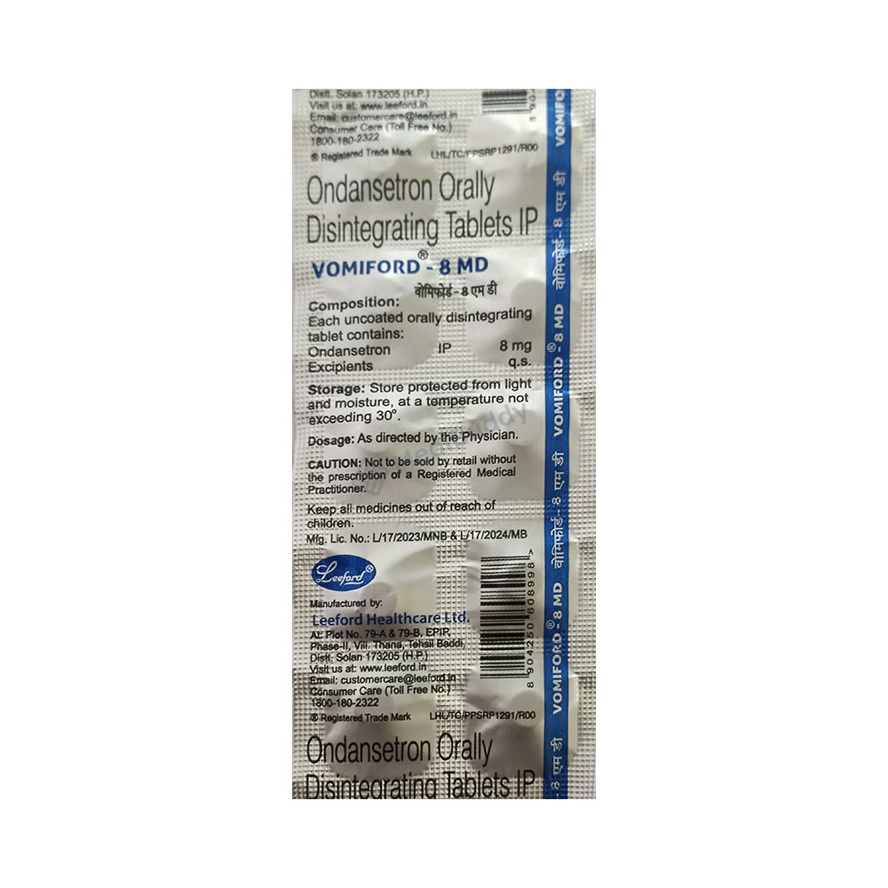 Vomiford 8 MD Tablet provides various benefits in the treatment of nausea and vomiting. This medication works by blocking the action of certain chemicals in the body that trigger feelings of sickness. It is commonly used to prevent nausea and vomiting caused by cancer chemotherapy, radiation therapy, and post-operative procedures. By taking Vomiford 8 MD Tablet as prescribed, patients can experience relief from these symptoms and recover more comfortably from their treatments.