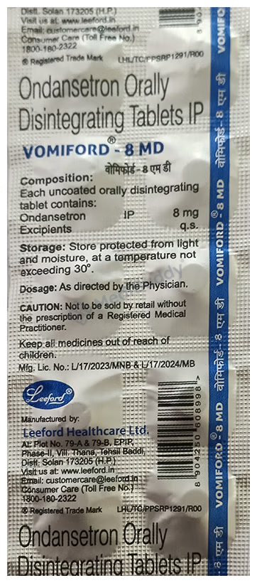 Vomiford 8 MD Tablet is a type of medicine known as an antiemetic. Its primary use is to manage feelings of nausea and the urge to vomit that can occur due to various medical reasons such as stomach issues. This medication is also beneficial in preventing nausea and vomiting that may arise from undergoing surgery, cancer treatments like chemotherapy, or radiation therapy.
