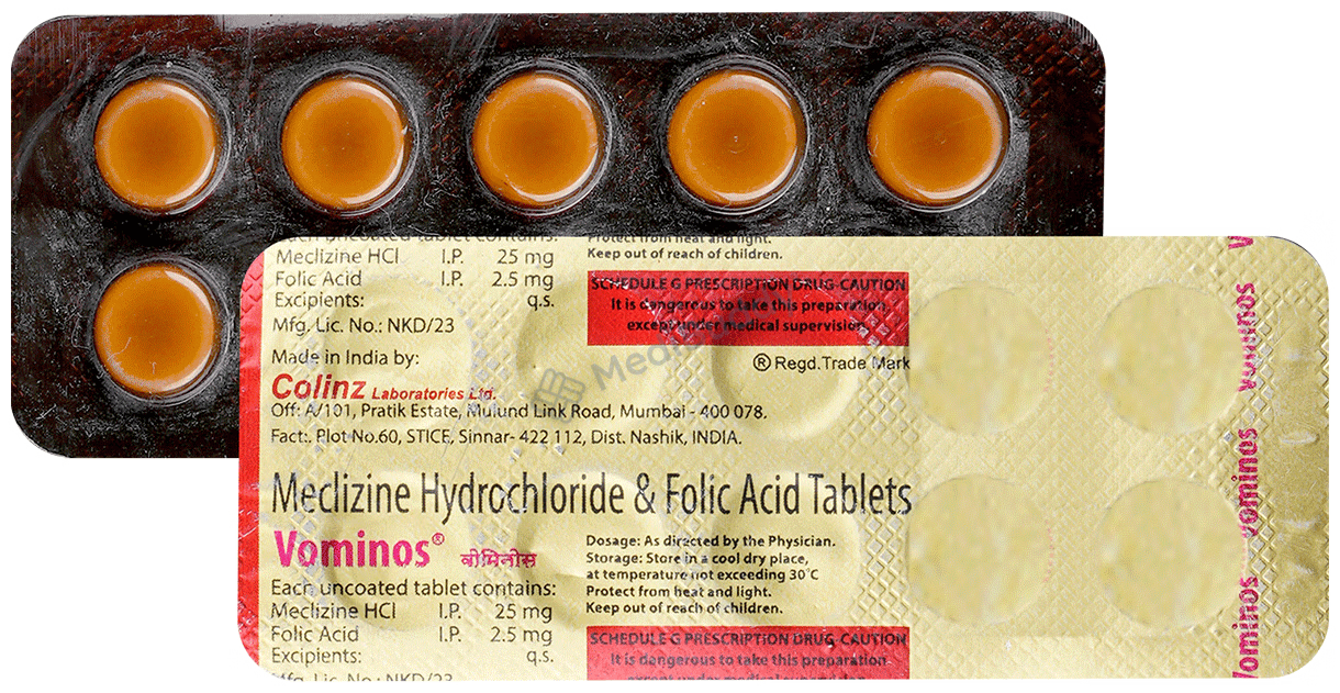 VOMINOS 25MG, containing Meclizine, is another medication within the antihistamine/antiemetic category employed for managing motion sickness, vertigo, and associated symptoms like nausea and dizziness. The drug works by regulating the activity of hair cells in the inner ear, reducing vestibular stimulation and alleviating vertigo symptoms. Additionally, it diminishes central nervous system activity, mitigating feelings of nausea and vomiting linked to motion sickness. VOMINOS 25MG should be used cautiously in individuals with specific medical conditions like asthma, liver or kidney disease, glaucoma, and enlarged prostate gland. Prior consultation with a doctor is advisable, particularly for pregnant or breastfeeding individuals, as the medication may not be suitable in these cases.