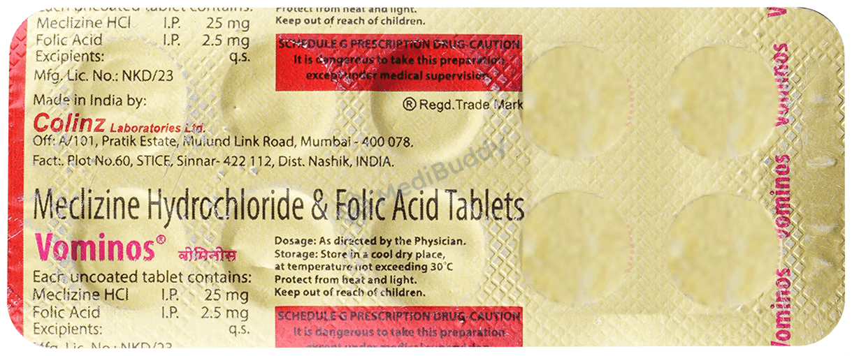 Vominos Tablet is used to treat nausea and vomiting during pregnancy. By blocking certain signals to the brain, it helps alleviate these symptoms caused by hormonal changes. Additionally, the tablet contains nutritional supplements that support the baby's immune system and brain development, while also aiding in reducing pregnancy-related nausea and vomiting. It is vital to follow the prescribed dosage and duration to effectively manage these symptoms. Be aware of common side effects like dry mouth, constipation, and dizziness, and consult your doctor if needed. Avoid alcohol while taking this medicine to prevent worsening drowsiness.