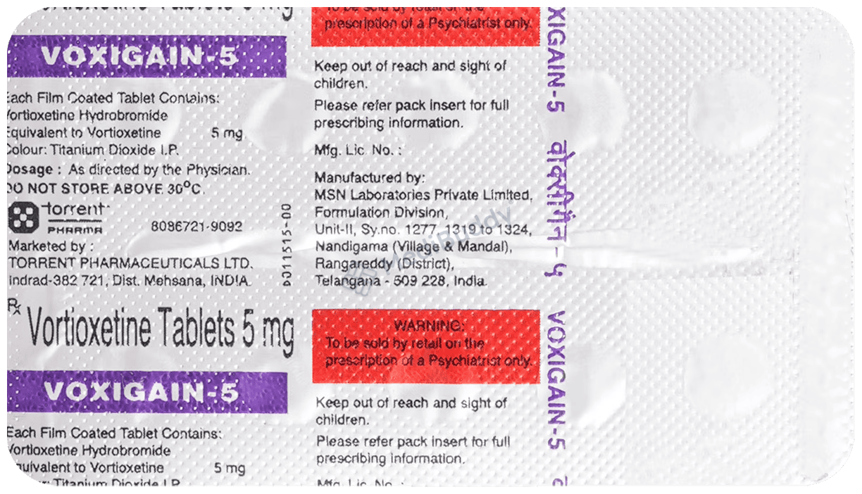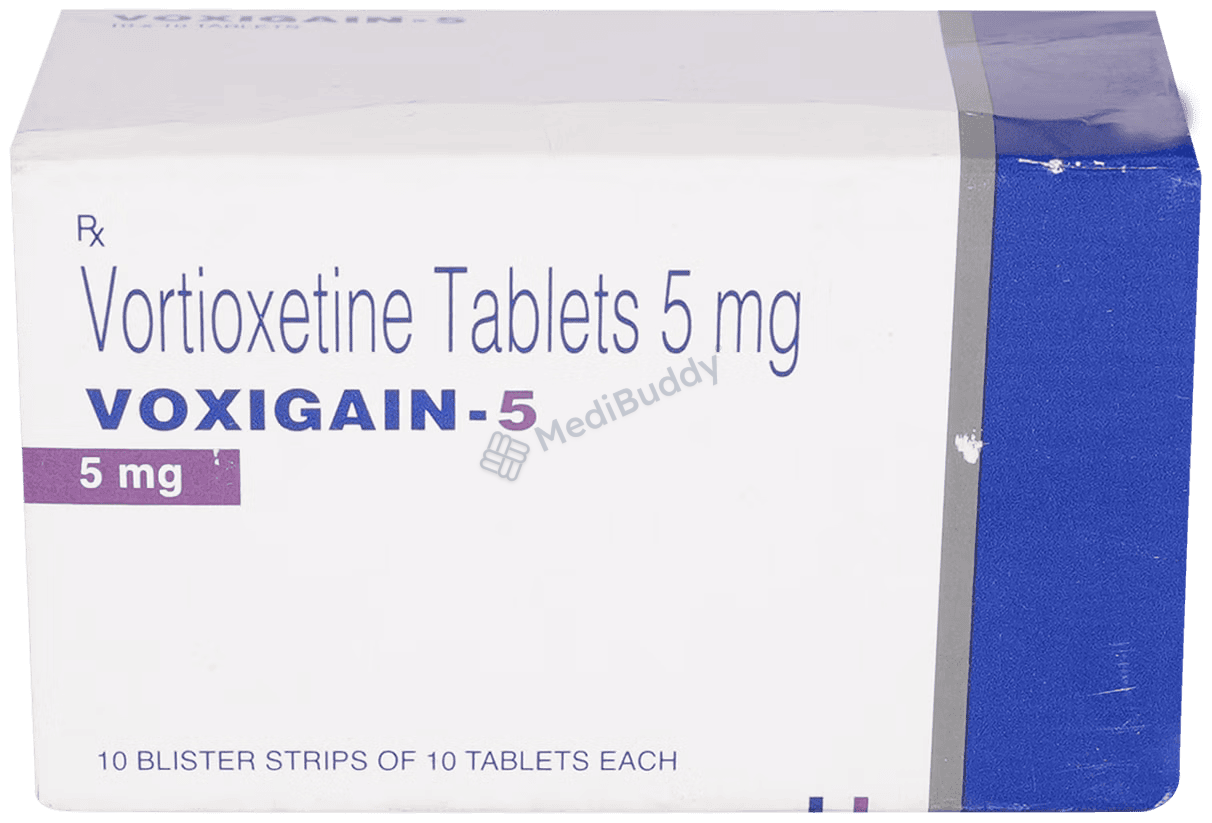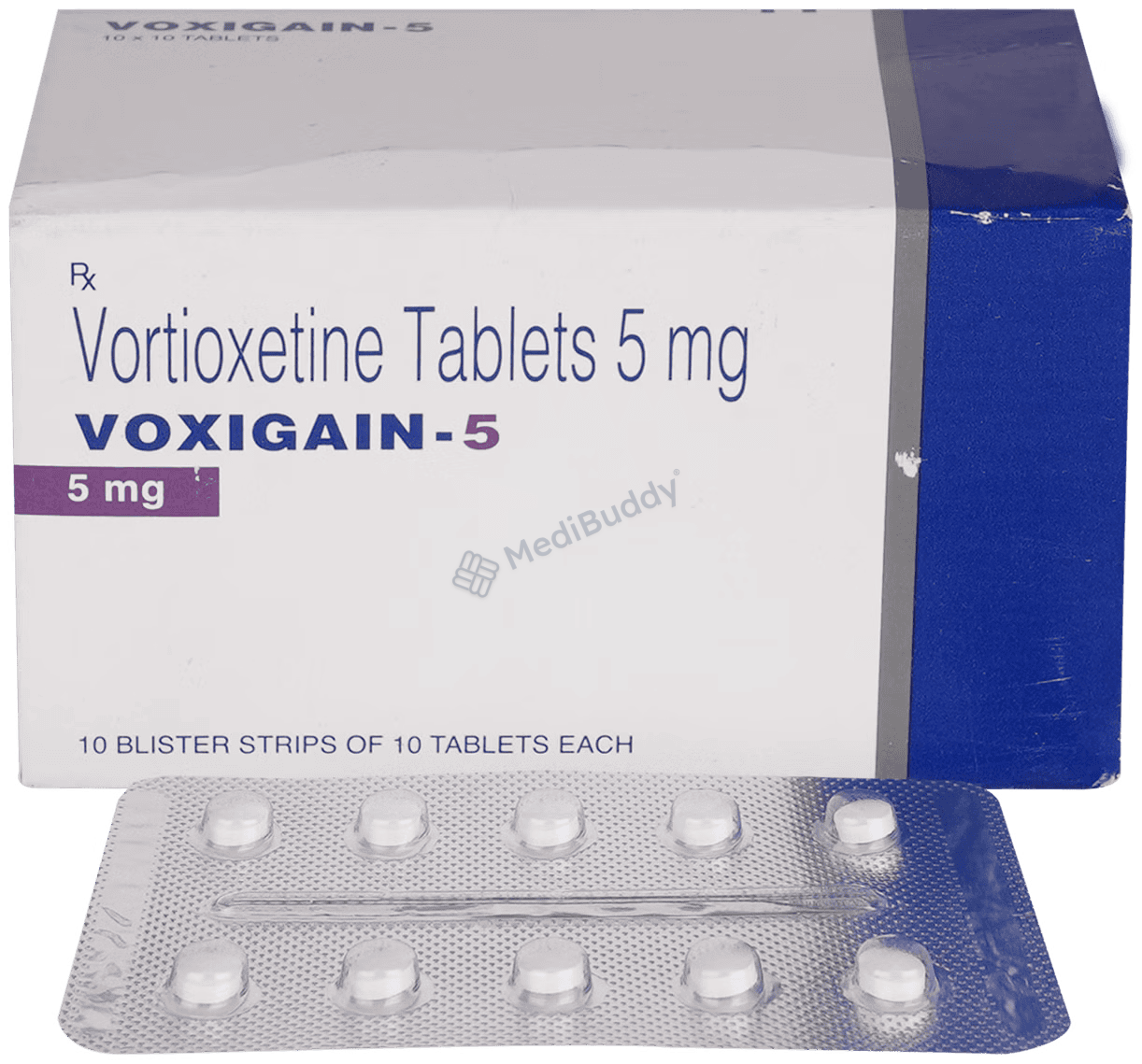 Voxigain 5 Tablet is a medication primarily used to treat depression in adults. This tablet falls under the category of antidepressants known as serotonin modulator and stimulator (SMS). The purpose of this medicine is to enhance mood and energy levels while reducing feelings of sadness and worthlessness commonly experienced by individuals with depression.