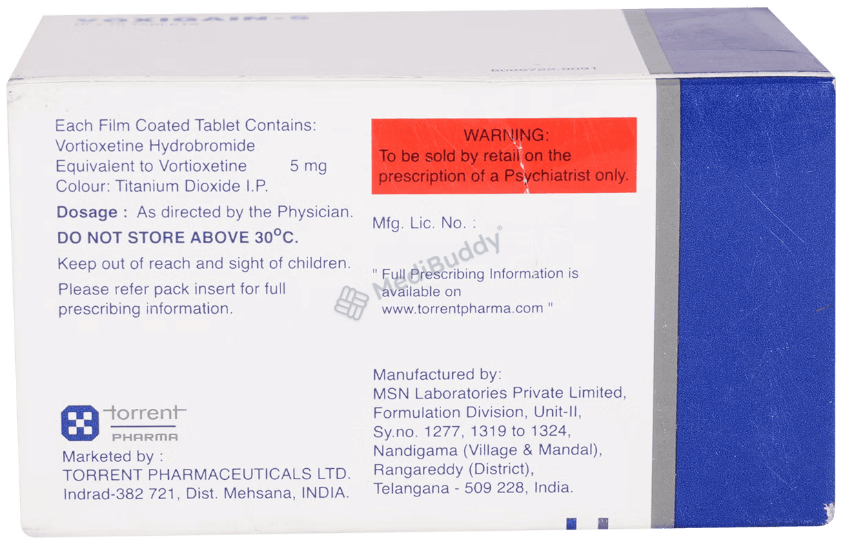 The active ingredient in Voxigain 5 Tablet is vortioxetine, which aids in increasing serotonin levels in the brain. Serotonin plays a crucial role in regulating energy, mood, and behavior, and boosting its levels can effectively alleviate depressive symptoms. It may take several weeks before experiencing improvements, and it is advised not to alter the dosage or discontinue the medication without consulting your doctor, even if you start feeling better.