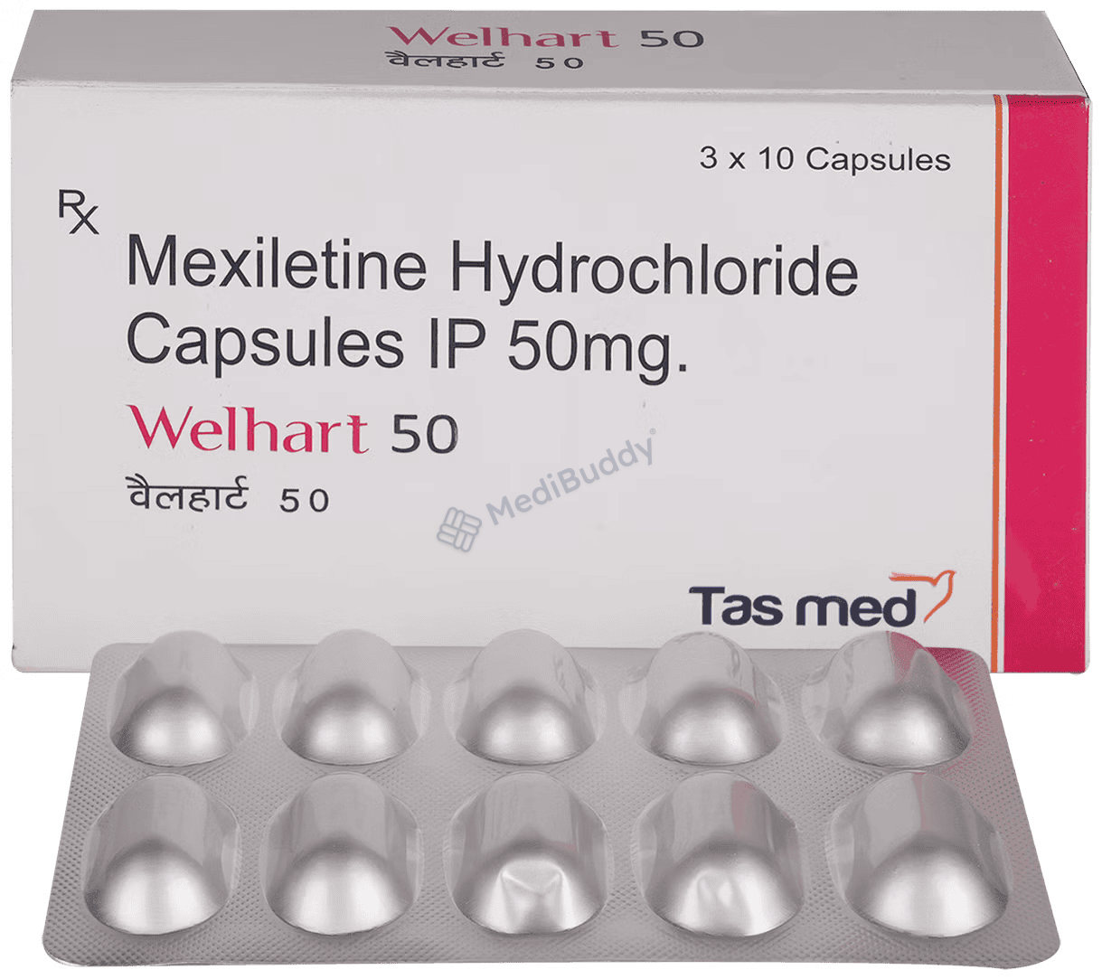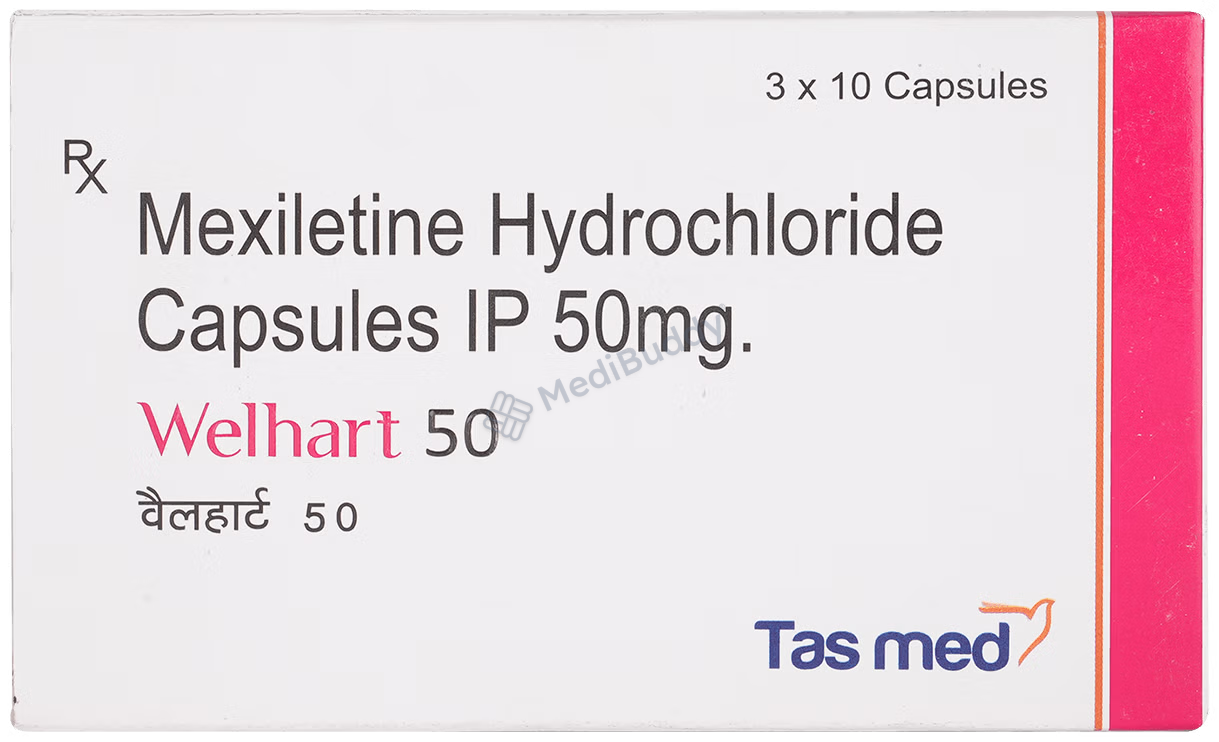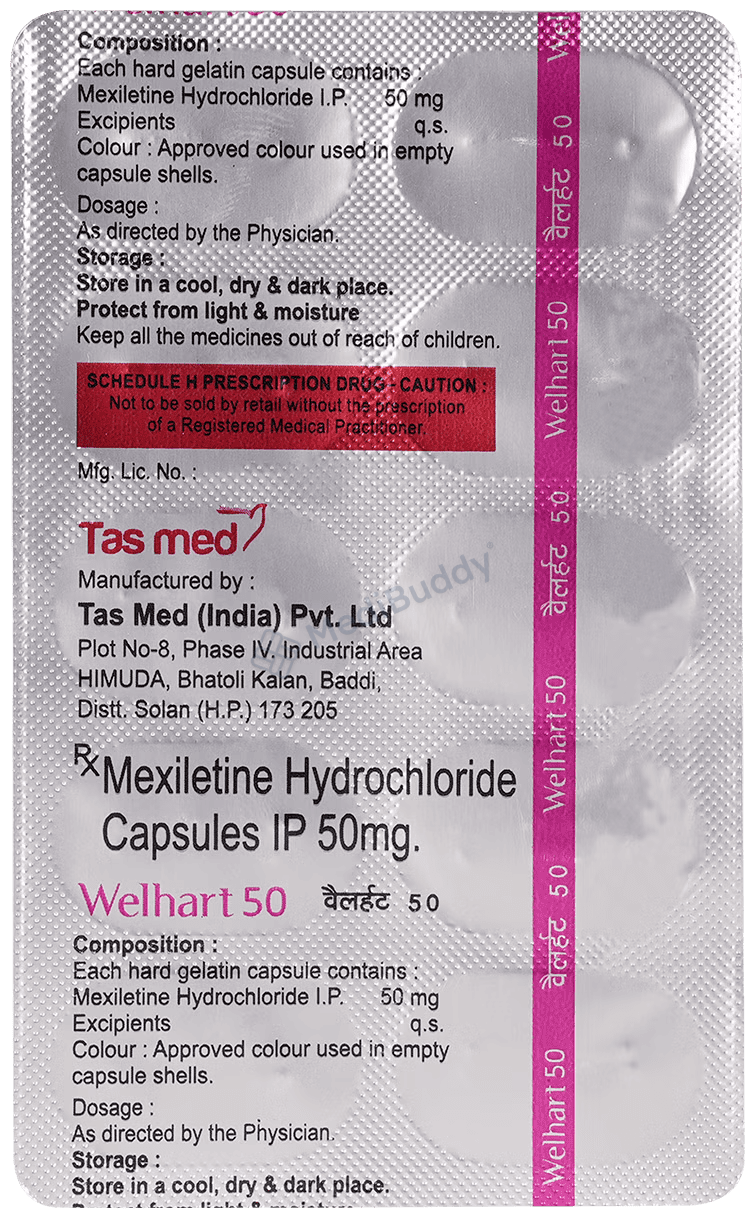 Welhart 50mg Capsule belongs to the class of antiarrhythmic medicines, specifically used to treat certain types of arrhythmias, which are abnormal heart rhythms. This medication works by blocking the abnormal electrical signals in the heart, helping to restore a regular and steady heartbeat. It contains Mexiletine, which reduces the sensitivity of heart muscle cells to electrical impulses, slowing down electrical conduction in the heart muscle to restore a normal heart rhythm.