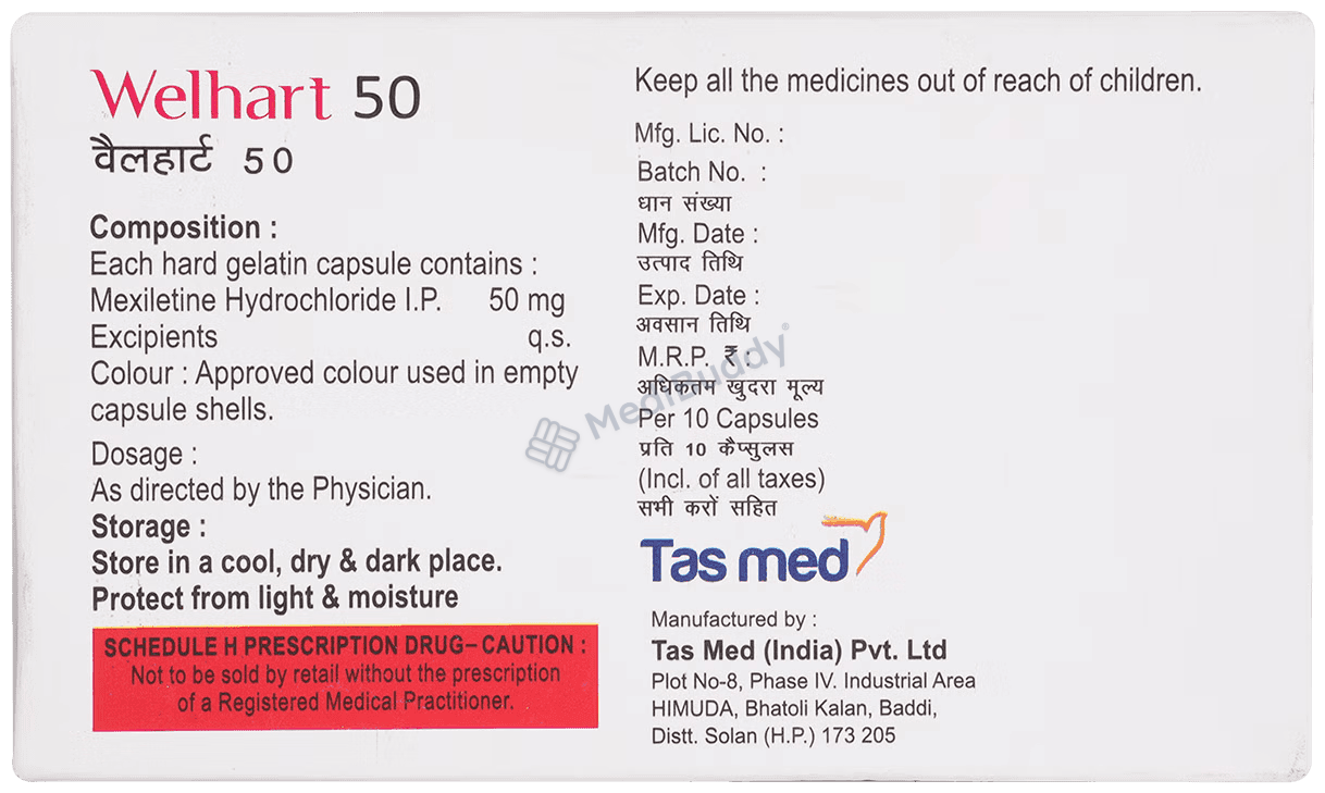 If you are allergic to Mexiletine, local anesthetics, or other medications, please inform your doctor before starting Welhart 50mg Capsule. It is advisable to avoid alcohol consumption while taking this medication, as it may worsen dizziness or drowsiness. Welhart 50mg Capsule may cause side effects like stomach pain, insomnia, dyspepsia, dizziness, tremors, chest discomfort, or headache. Most of these side effects do not require medical attention and tend to resolve over time, but if they persist, consult your doctor. Drive only if you are alert after taking Welhart 50mg Capsule, as it may cause dizziness, drowsiness, or blurred vision in some individuals.