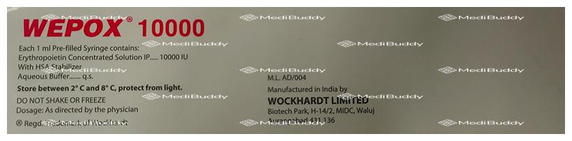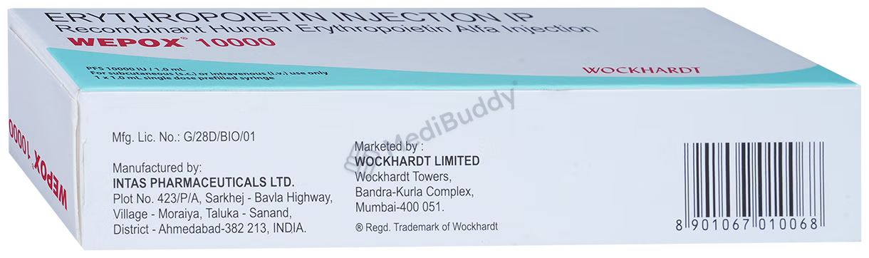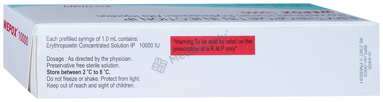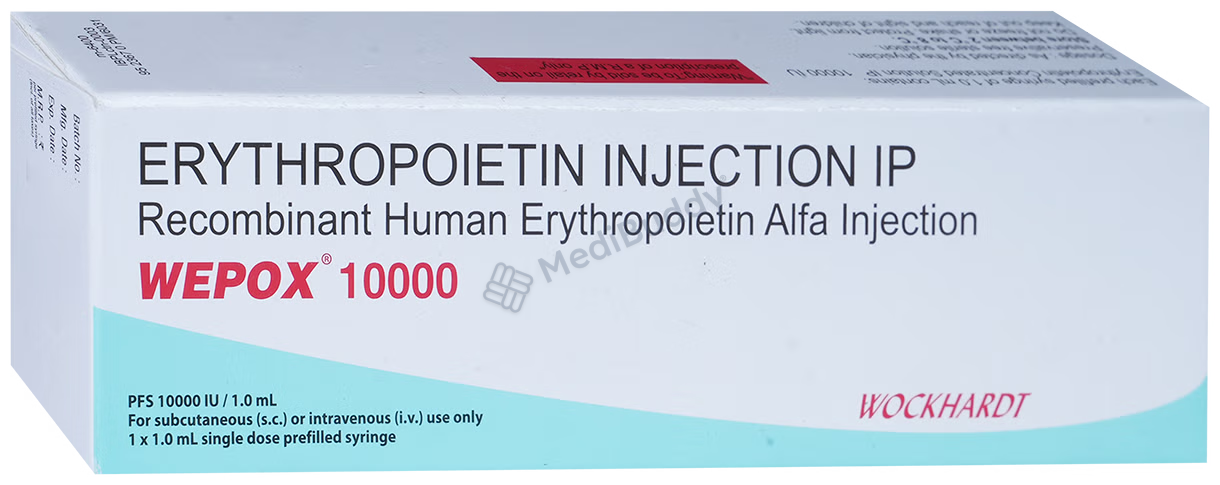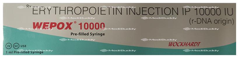 Wepox 10000IU Injection is a medication designed to support the production of red blood cells in the bone marrow. This drug is primarily used in the treatment of a specific type of anemia that is a result of kidney disease. Additionally, it is utilized for addressing anemia caused by cancer chemotherapy and certain HIV medications.