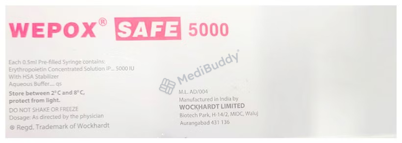 Wepox Safe 5000IU Injection is used to treat anemia caused by chronic kidney disease, cancer chemotherapy, and HIV treatment. Anemia is a condition where the body lacks enough red blood cells to carry oxygen, leading to weakness and tiredness. This medicine helps the bone marrow produce more red blood cells, improving the symptoms of anemia. The injection is administered either under the skin or into a vein by a healthcare professional. Common side effects include nausea, vomiting, fever, and increased blood pressure, which usually improve over time. Prior medical conditions such as high blood pressure or heart disease should be disclosed to the doctor before using this medication. Regular monitoring and tests may be required during treatment to ensure its safety and effectiveness.
