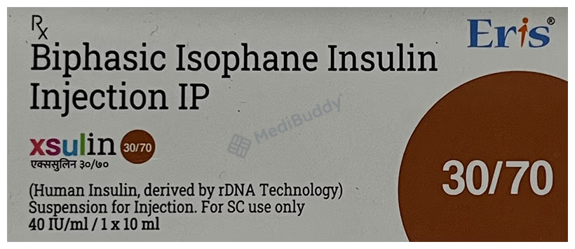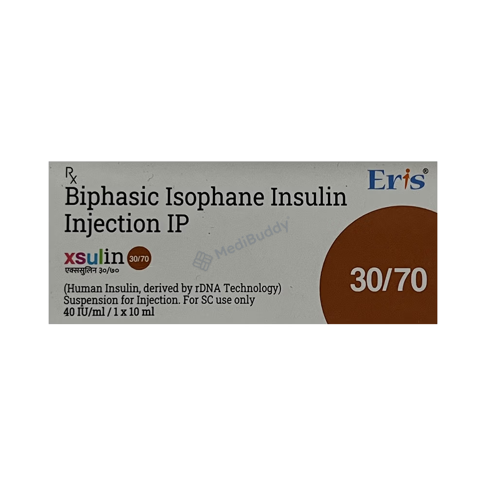 Xsulin 30/70 Suspension for Injection is a short-acting insulin used to treat type 1 and type 2 diabetes mellitus by controlling blood sugar levels. It is taken before meals to prevent complications like kidney damage and blindness. This insulin should be used in combination with other diabetes medications, as prescribed by your doctor. Regularly monitor blood sugar levels, follow the correct injection procedure, and maintain a healthy lifestyle. Possible side effects include low blood sugar, injection site reactions, and weight gain. Consult your doctor if side effects persist.