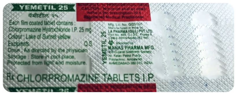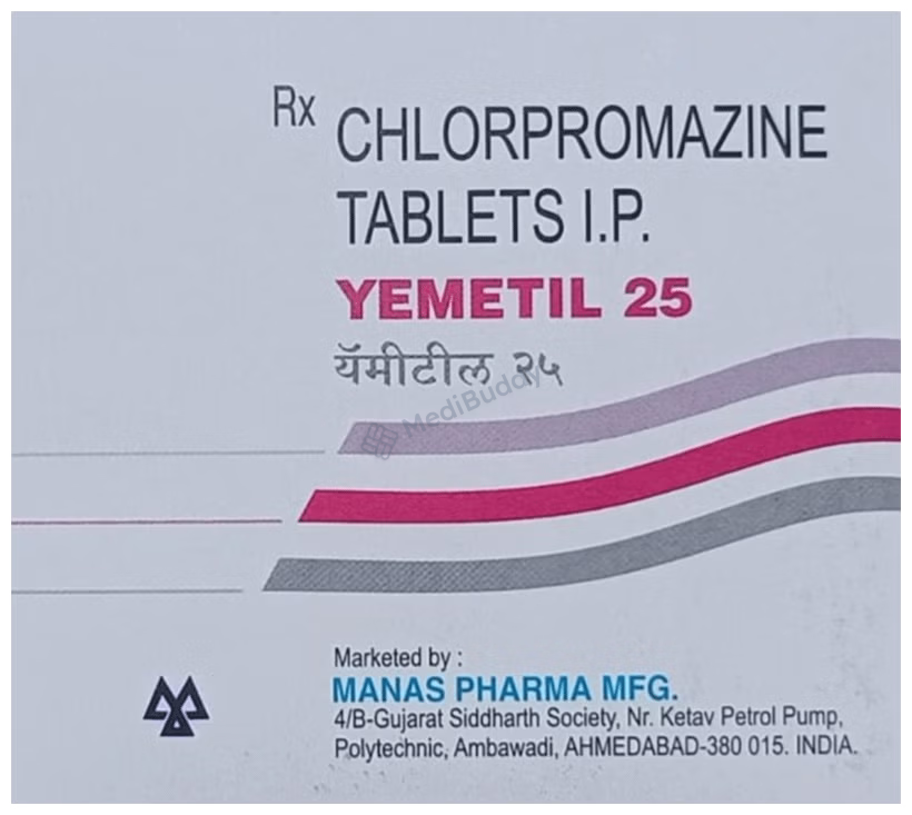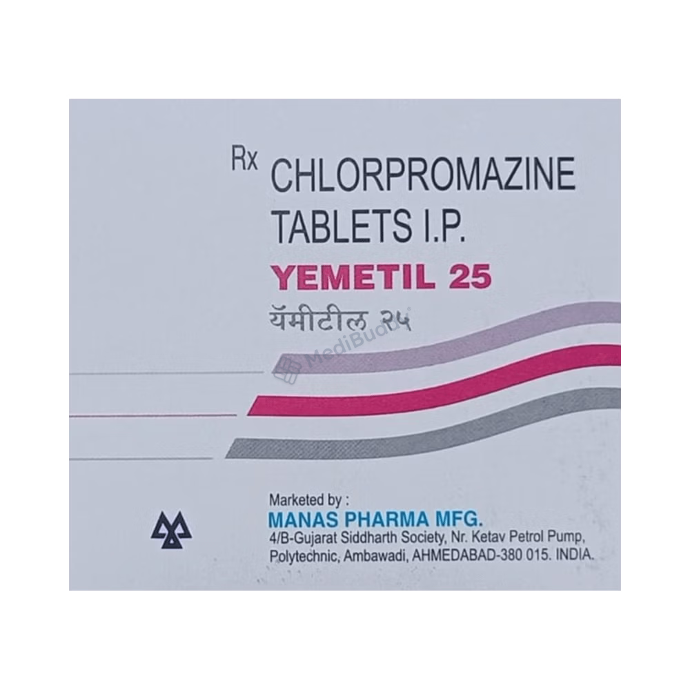 This medication is known as an antipsychotic and is used in the treatment of schizophrenia, psychosis, bipolar disorder, nausea, vomiting, anxiety before surgery, and chronic hiccups. Yemetil 25 Tablet 10's contains Chlorpromazine, which acts by blocking dopamine in the brain to alleviate symptoms of schizophrenia and bipolar disorder. Additionally, it rebalances dopamine levels to improve cognition, mood, and behavior. Yemetil 25 Tablet 10's also blocks other natural substance receptors in the brain, preventing nausea and vomiting. It is essential to take Yemetil 25 Tablet 10's as prescribed by the doctor for the recommended duration based on the individual's medical condition.