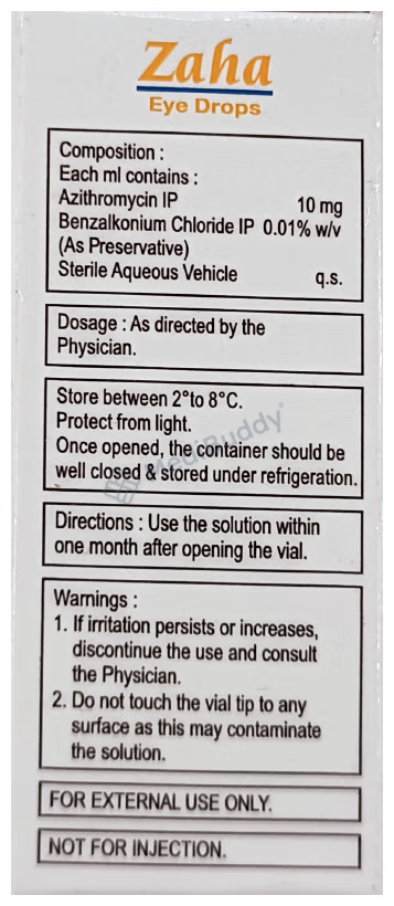 In summary, Zaha Eye Drop, containing azithromycin as its active ingredient, is a reliable solution for treating bacterial eye infections. Adhering to prescribed guidelines, being aware of potential side effects, and seeking medical advice when needed can ensure a safe and effective treatment experience.