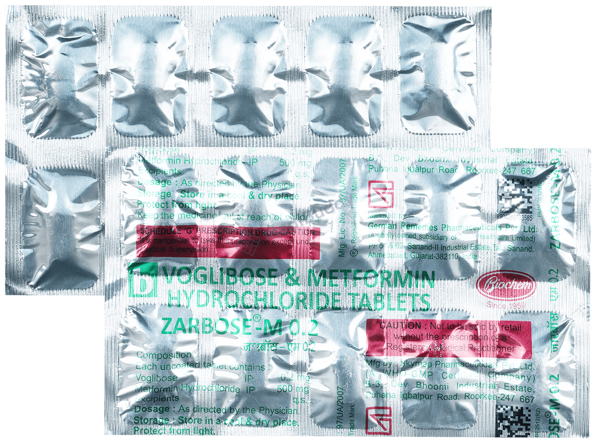 Zarbose-M 0.2 Tablet is used in the treatment of Type 2 diabetes mellitus. It helps in controlling high blood sugar levels by slowing down the breakdown of food into glucose in the intestine. By reducing the rise in blood sugar levels after meals and eliminating excess glucose through urine, it plays a vital role in managing diabetes. This medication is essential to prevent serious complications such as kidney damage, eye issues, nerve problems, and limb loss. Regular intake, in combination with a healthy diet and exercise, supports a healthy life by reducing cardiovascular disease risks.