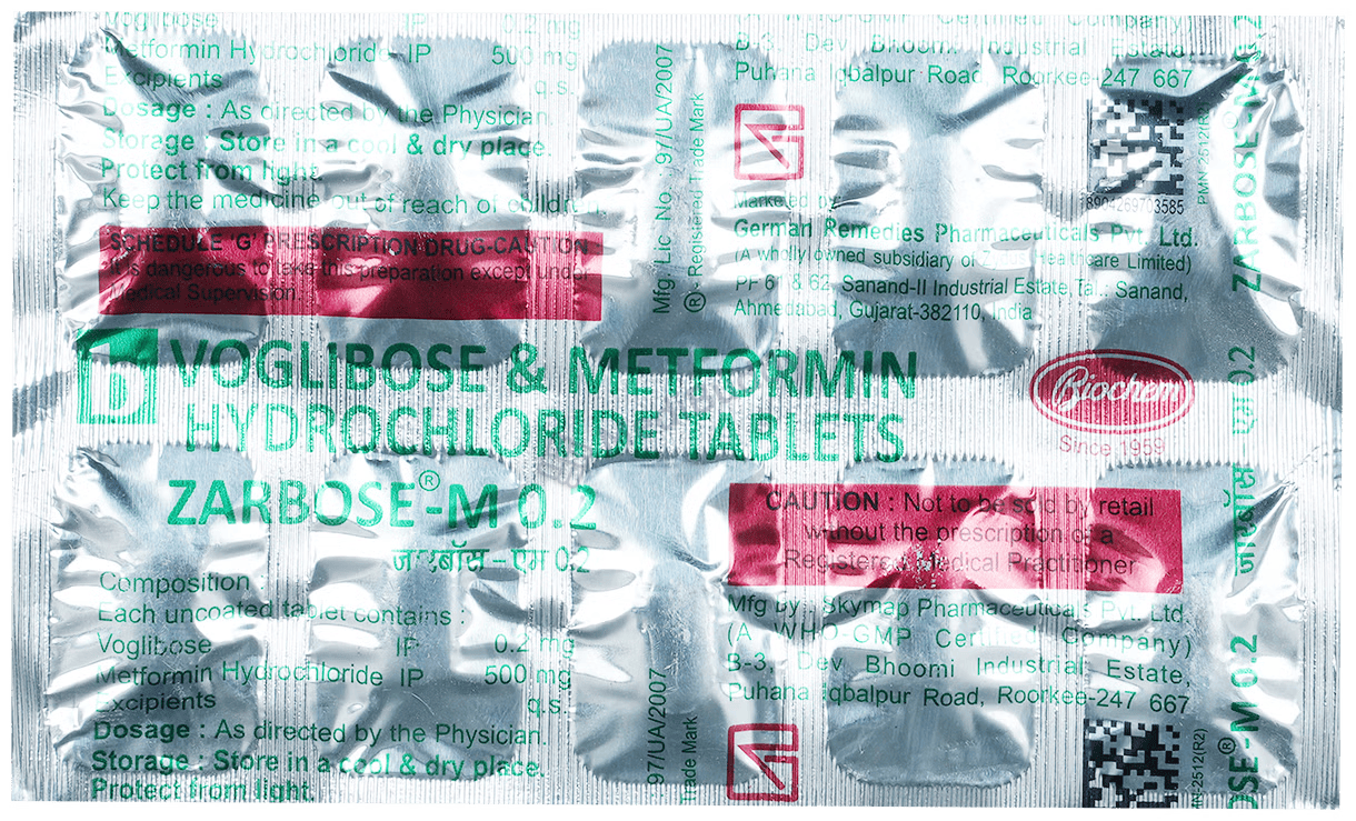 Zarbose-M 0.2 Tablet is a medication classified as an anti-diabetic drug. It is a blend of medicines designed to assist in managing type 2 diabetes mellitus in adults. This tablet aids in regulating blood sugar levels in individuals with diabetes. It is essential to take Zarbose-M 0.2 Tablet with food consistently at the same time each day for optimal results. Your doctor will determine the most suitable dosage for you, which may be altered over time based on how effectively it is controlling your blood sugar levels.