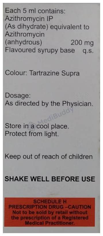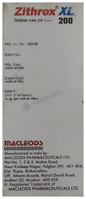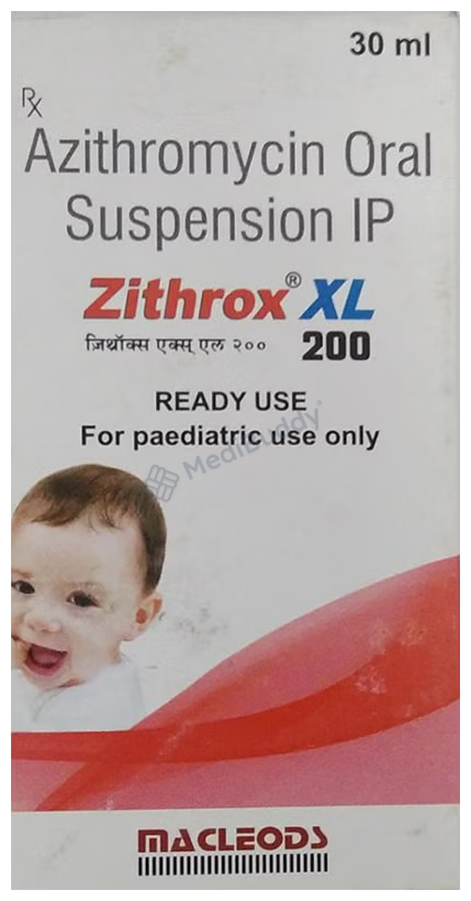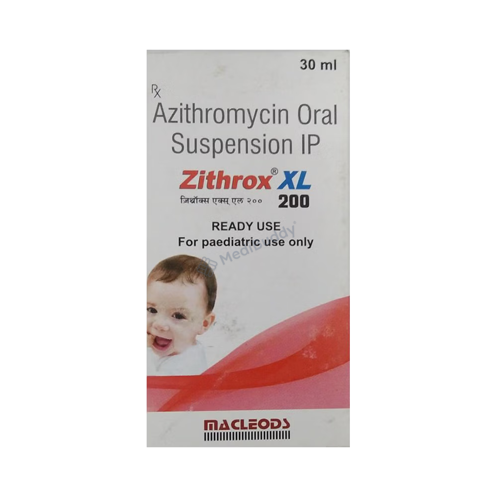 Zithrox XL 200mg/5ml Dry Syrup is an antibiotic used for treating various bacterial infections in children affecting the ear, eyes, throat, lungs, skin, and gastrointestinal tract. It works by halting the growth of infection-causing bacteria. Administered once daily, the dosage may vary based on the infection type, severity, and the child's age and weight. Noteworthy, if vomiting occurs within 30 minutes post-administration, redosing is recommended. While common side effects like nausea, abdominal pain, and diarrhea may arise initially, they usually diminish with continued use. Always complete the prescribed course for effective treatment.