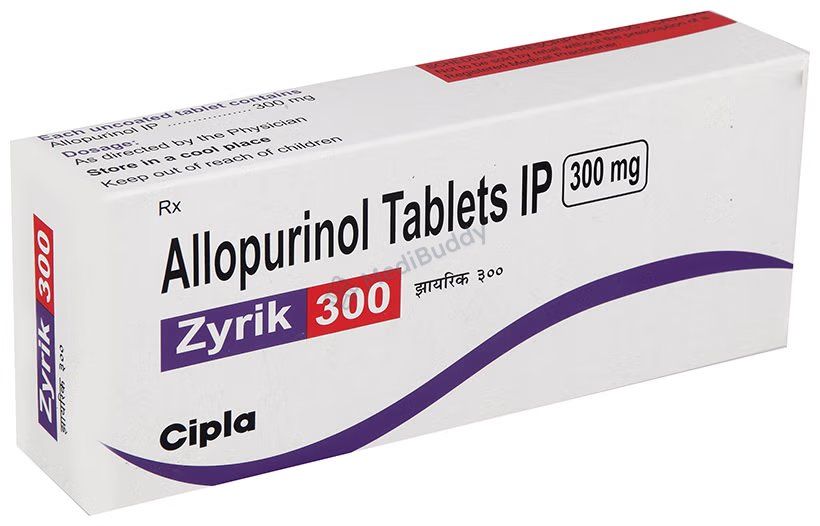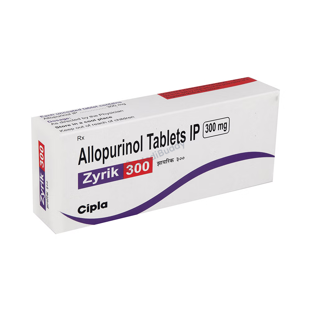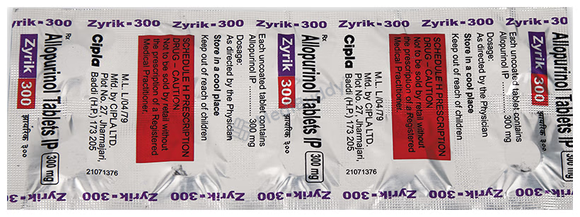 Zyrik 300 Tablet is used to prevent and treat gout, which is caused by high levels of uric acid that form crystals in joints and kidneys, leading to pain. By lowering uric acid levels, this medicine helps prevent crystal formation and reduce gout symptoms. It should be taken regularly even when not experiencing gout attacks. Adjustments to diet and staying hydrated can be beneficial. Common side effects include nausea, diarrhea, and elevated liver enzymes. Seek medical advice if you notice severe symptoms or signs of liver problems. Prior medical conditions and pregnancy should be discussed with a doctor before using this medicine.